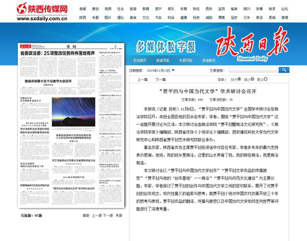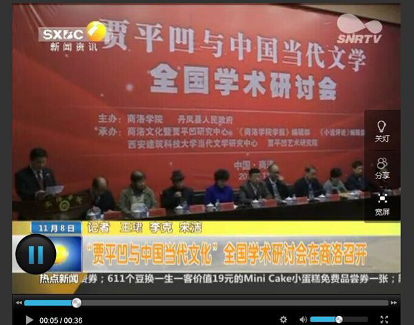 陕西广播电视台:11月8日陕西一套《第一新闻(午间播报)》栏目http://www.snrtv.com/content/2014-11/08/content_11808462.htm#(点击该网络链接,查找该页面下方第13个新闻视频《“贾平凹与中国当代文化”全国学术研讨会在商洛召开》)