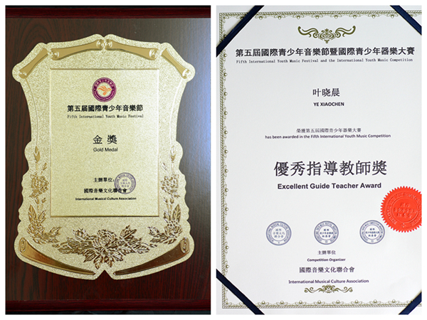近日,由国际音乐文化联合会、广西师范学院等主办的第五届国际青少年音乐节暨国际青少年器乐大赛决赛落下帷幕,我校艺术学院音乐系两名同学王雅致、王维成获得青年组金奖,指导教师叶晓晨获得优秀指导教师奖。
