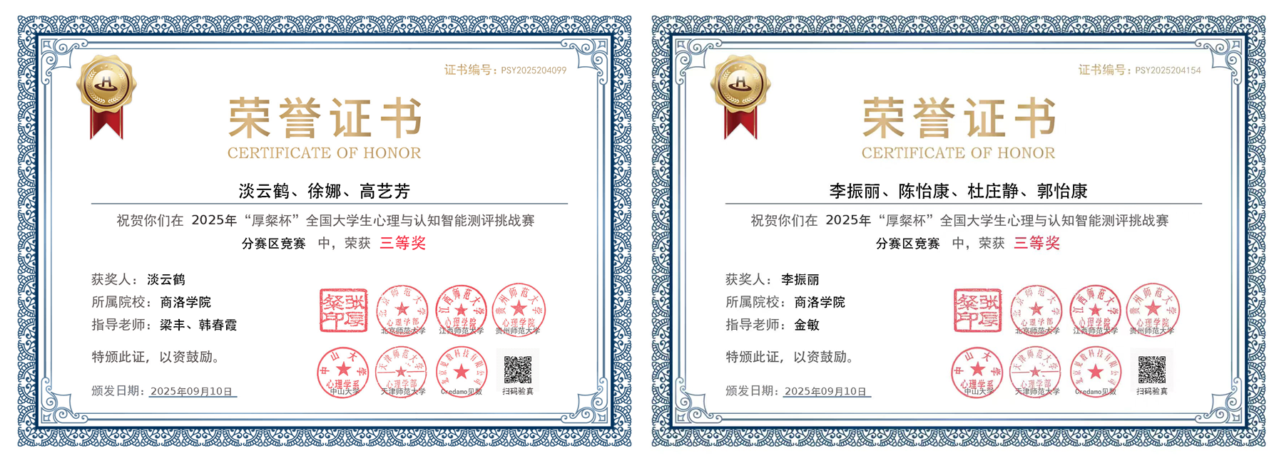 近日,由教育部高等学校心理学类专业教学指导委员会、全国大学生心理测量赛事联盟主办,北京师范大学等单位承办的2025年“厚粲杯”全国大学生心理与认知智能测评挑战赛西部赛区比赛圆满落幕,我校教育科学学院应用心理学专业2支参赛队伍均荣获三等奖,为省内同类院校最好成绩,充分展现了我校应用心理学专业人才培养成效。