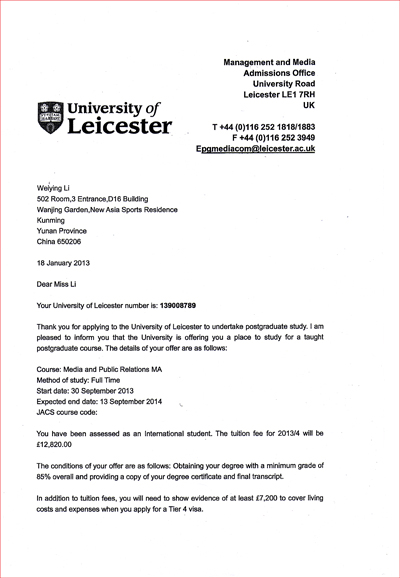 近年来,我校本科毕业生报考研究生总数和上线人数连续实现翻倍增长,不断刷新考研纪录。除了国内各重点大学外,今年在考取国外研究生方面,我校亦实现了零的突破。近日,外语系2009级英语本科专业的李玮莹同学成功考取了英国莱斯特大学研究生,被正式录取为该校媒体和通信学院媒体与公共关系专业硕士研究生,成为我校历史上首位考取国外研究生的学生